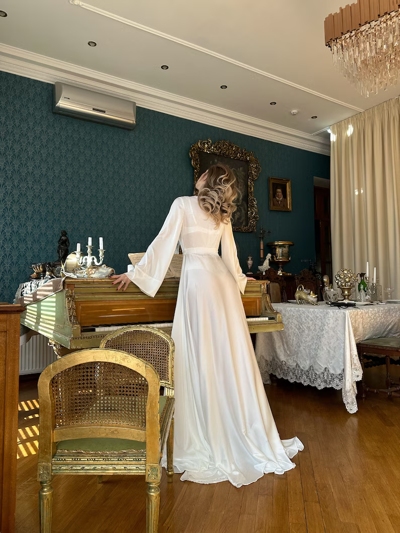 Halat din matase satinata  maneci putin  evazate , volum si amploare foarte mare .
